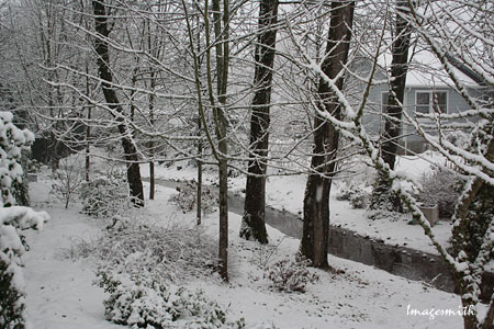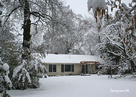 The backyard covered in snow. By the time it ended we had about 6 inches, at least three times what we got last year. |