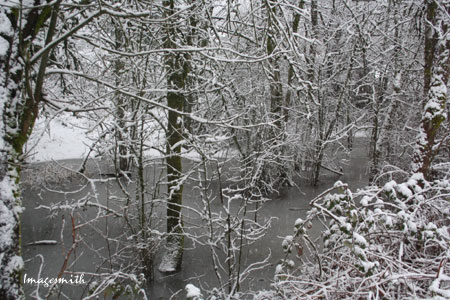 The poorest house in the neighborhood sits next to the swale above. It's made from an old single-wide trailer that's been added on to. There's a tiny porch and a single-car garage with its roof caved in. I liked the yellowish colors as an accent against all the white and black of the snowy day, though. |
