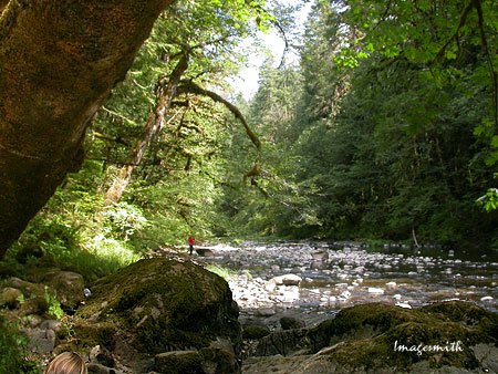 Upstream, Cade ventures ahead. See him in the red shirt. |