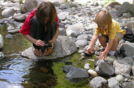 Cade and Con examine creek life: rocks and tiny snails in spiral shells. |
