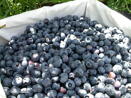 Our basket full of blueberries, the equivalent of two good-sized buckets. These are no-spray berries, and the prices are nothing like in the supermarkets; here they're just $1.50/lb... unless you pick more than 50 pounds, in which case you get a discount! |
