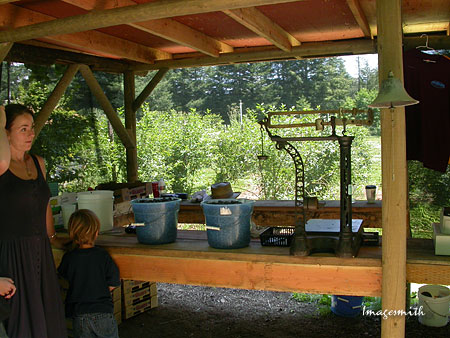 | Waiting for our buckets to be weighed on the old-fashioned scale at the farm stand. |