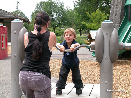 Con tries his hand at pumping water, which turned out to be his favorite activity. The water flows down a trough and turns the mill wheel at the lower right of the picture. There are a number of opportunities for playing with water. |