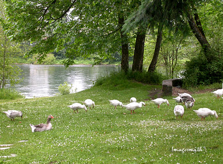 | On the way home, we stopped where the river bends to watch white geese feeding on the lawn, while adult Canada Geese led their half-grown goslings down to the water's edge for a swim. |