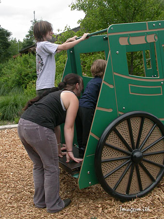 The stagecoach is a clever historical version of a seesaw. Four shock-absorbers provide a ride that dips forward and back, giving an idea of what travel might have been like in the early settlement days of the mid-1800s... with a little current-day fun added, of course. |