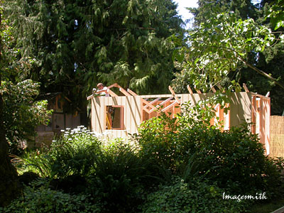 I'd seen some nifty/impressive utility buildings from Better Built Barns in Salem on display at Jerry's, our very cool Eugene home improvement store. Paul and I went to Salem, looked over our options, and signed up. Because they put together many similar buildings, the Better Built crew has their construction down to an efficient routine. This picture shows the work about an hour into the build. |