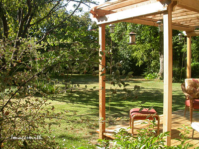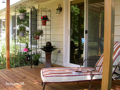 The deck in summer. I stapled shade cloth over the top this time to add a little shelter. |