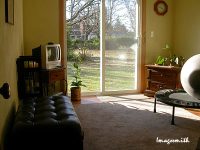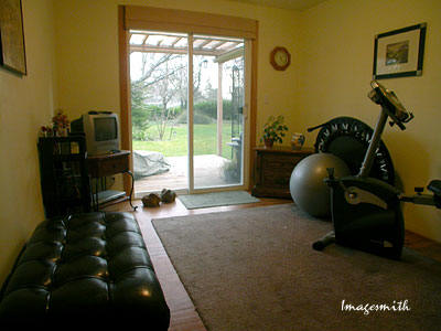 The same room after replacing the window with a sliding glass door. Suddenly the room was opened to the backyard (with bare trees in this winter pic, but very lush and secluded in spring and summer.) Now this is our workout room, a great place for a little morning tai chi, a bounce on the trampoline or for riding the recumbent bike at night, or when it's too rainy to venture outside. |