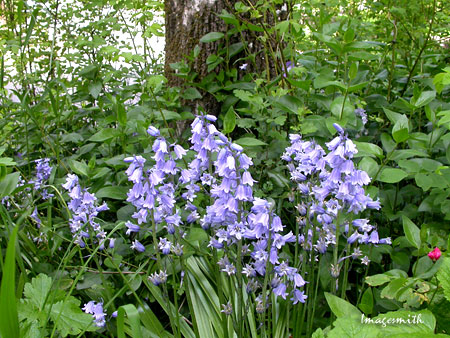 Wood hyacinths are still blooming beside the paths, their violet blues echoed by the blossoms of vinca. This is the only place I've ever seen white vinca in addition to the more common blue variety.