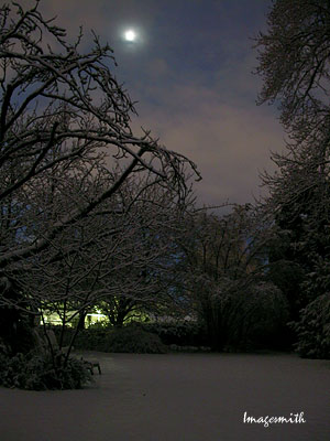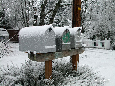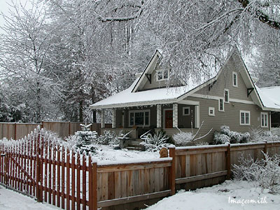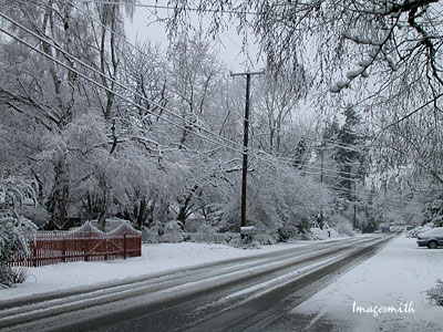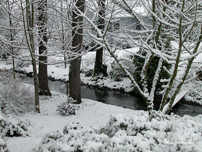 Icy water running in one of our typical drainage swales creates a temporary winter creek through this yard. |