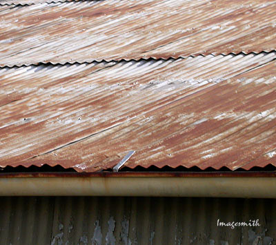 ![]() Slanted ribs of the rusty corrugated metal roof of the plumbing shop |