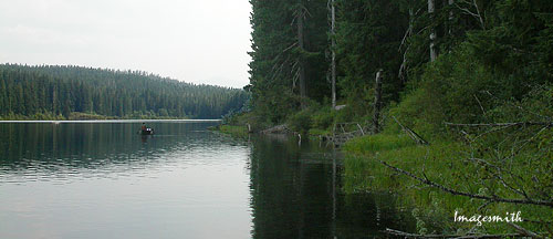 Hiking trails circle the lake, taking the visitor through the domain of Douglas fir and redwood, with the occasional stream crossing the trail on its way into the lake. Here, Ben and Paul stop to talk at trailside.