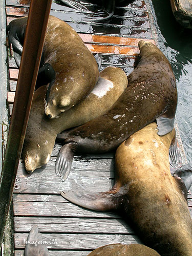 ![]() Visitors line up along a pier to watch harbor seal below. The seals' constant barking assures a steady stream of onlookers.