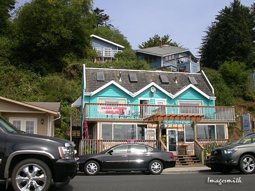 Typical restaurant building along Bay Boulevard, which runs beside the edge of Yaquina Bay. The area is filled with restaurants, art galleries and souvenir shops as well as fish processing warehouses.