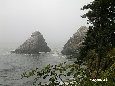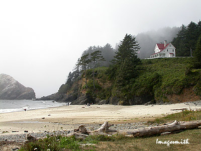Heceta (hu-SEE-tah) Head lightkeeper's house overlooks a beach cove. The lighthouse itself, on the cliff high above and beyond the keeper's house, is not visible in this picture. |