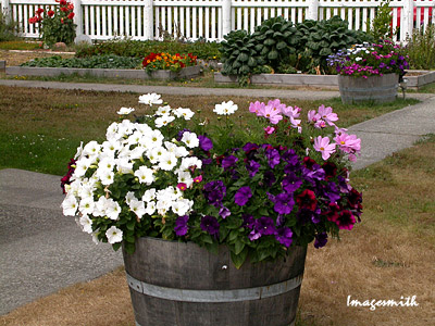 Behind the keeper's house, colorful barrels of flowers share space with an herb garden. |