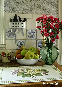 I'd been faithfully saving up aluminum drink cans for quite some time and finally had two big bags full, so this morning I took them over to the recycler, who in turn gave me a voucher for a nearby supermarket. I picked up stuff I usually don't get, including the nice, spicy carnations in the picture (at left) as a visual treat. Such are the simple satisfactions of the low-budget lifestyle. It's a lot like being a hunter-gatherer, except that the prey you're stalking is the exceptional bargain. (The textured green glass vase, btw, came from the 99-Cent store--a cool find for a buck.) |