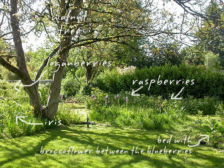 The back left corner of the yard as seen from near the walnut