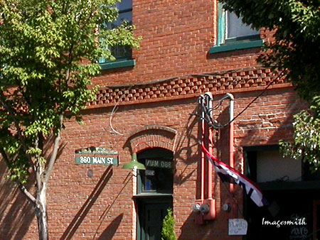 This tall window along the side of a Main Street shop displays jewelry, and shows off the old brickwork of which many nearby buildings are constructed.