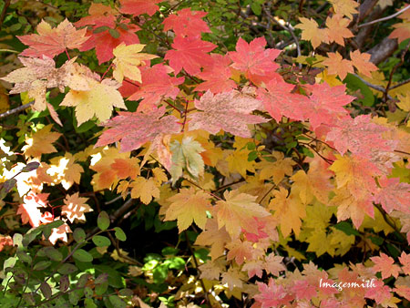 ![]() Vine maples in dappled light turn a variety of bright pastel shades.