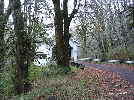 The Deadwood covered bridge, one of 20 covered bridges in Lane County, is located on a small gravel road surrounded by trees covered with moss and ferns. (yes, ferns sprout all over the tree trunks.) The community of Deadwood has a population of about 500. |
