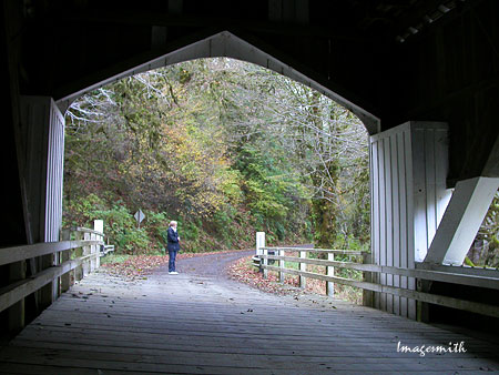 My friend Mary stands at the edge of the Deadwood covered bridge. |