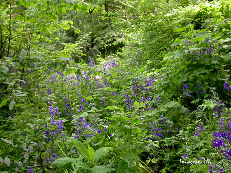 Wood hyacinths are still blooming beside the paths, their violet blues echoed by the blossoms of vinca. This is the only place I've ever seen white vinca in addition to the more common blue variety.