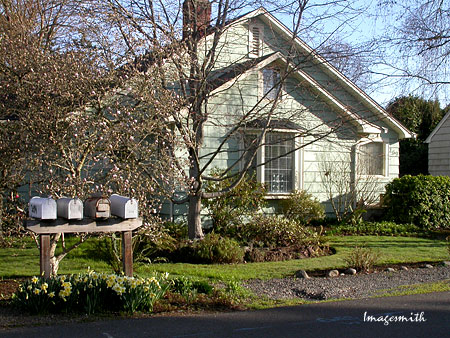 ![]() Typical modest home on Sunnyside Drive, with daffodils by the mailboxes