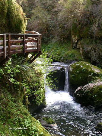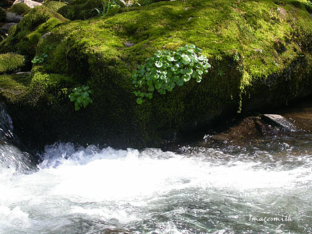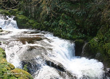 Water stair-steps its way downstream, rushing past a wall of moss and ferns.