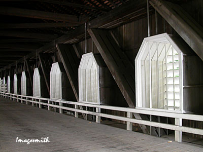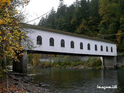 Goodpasture bridge as seen from the edge of the McKenzie River. Fishermen often dot the riverbanks, or cast their lines from the bowed-hull drift boats that were developed specifically to navigate this river. |