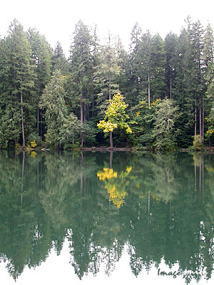 Always water: the edge of Leaburg Lake, created by a hydroelectric dam on the river which is run by EWEB, the Eugene utility company. The highway separates the mountainside from its mirrored reflection. |