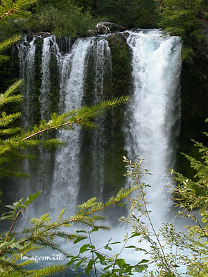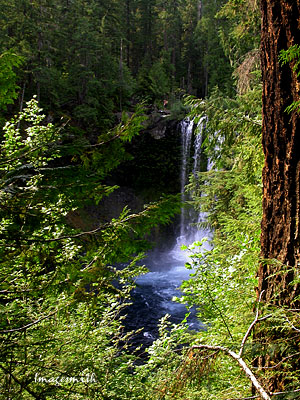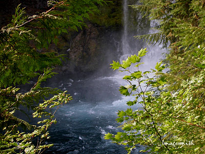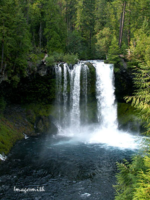 Heading home, we stopped to see Koosah Falls just a few miles from the lake. Here the McKenzie takes its second 100 ft. plunge in roughly a mile (the first being at Sahalie Falls.) Well-kept trails lead to several convenient observation points. Far below you, waters plunge roaring into a fern-and moss-bordered bowl before continuing their rush down the mountains and into the McKenzie Valley. |