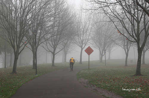 ![]() A lone biker rides the silent path toward downtown.