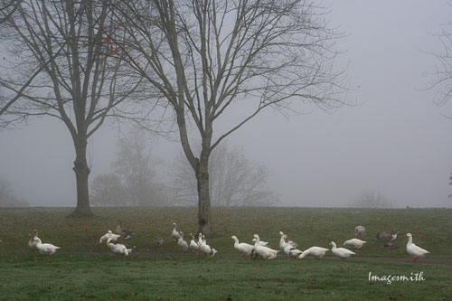 Getting closer, a flock of geese appeared, their white feathers bright spots in a world of gray.