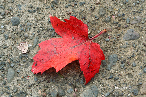 Close to the parking lot, a maple leaf adds a bright contrast