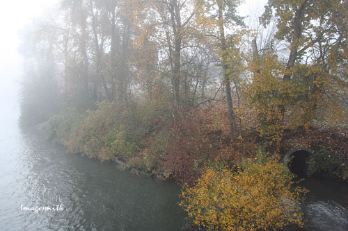 Along the riverbank, the last fall colors stand out in the