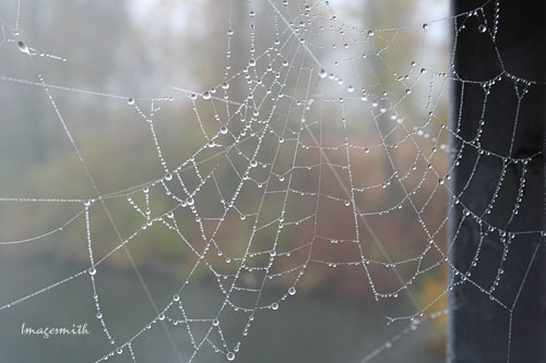 Hanging from the bridge railing, a fragile spider web