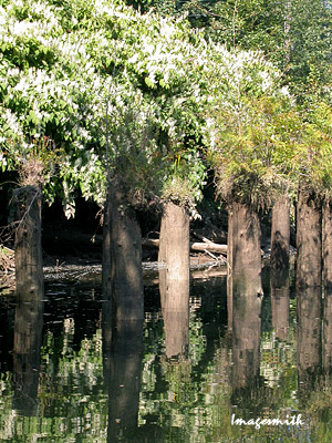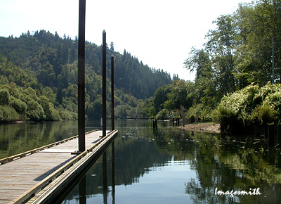 Along the riverbank I saw what's become an increasingly familiar sight during my time in Oregon--flowering plants I'm completely unfamiliar with. The bushes at right extended anywhere from 5 to about 20 feet along the riverbank and were filled with curious upright spikes of tiny flowers, very picturesque along the water's edge. |