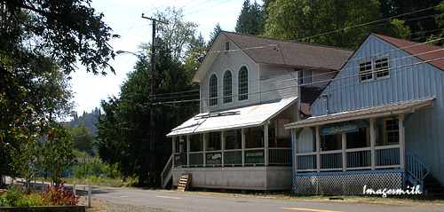 Across the road from the riverbank stands a row of shops that constitute the entire Mapleton commercial district. These are the backs of two multi-tenant buildings that house a hardware store, fishing/bait shop, hairdresser and several other businesses. |