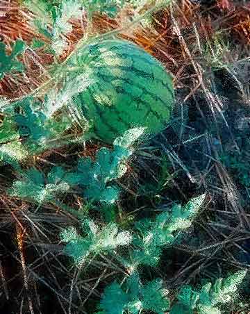 The summer ran dry and hot. The tall grasses that had grown up around the vine by the roadside turned pale and crisp until they made whispering sounds in the afternoon breeze and filled the night with the sweet, sleepy smells of summer growing old. The vine began to wither from lack of moisture and a crack appeared in the skin of the one watermelon that had survived, so that a little bit of pink insides showed. A motor scooter drove along the shoulder of the road and narrowly missed the melon. |