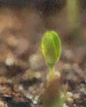 When the rains were past, a tiny mound appeared over the spot where the watermelon seed had gone down. It was high enough to be a hill for ants to climb over, but it only grazed the belly of a passing beetle. Soon two green leaves appeared in the center of the mound, held close together like diving hands, and a small plant rose slowly from the ground into the air and began to spread. |