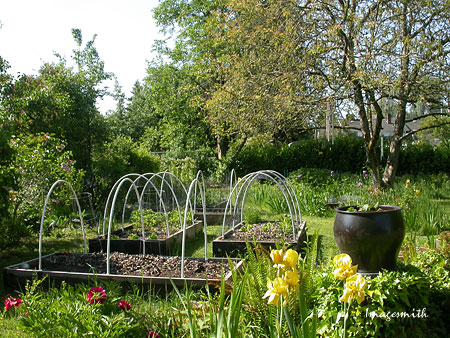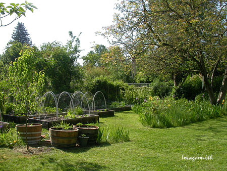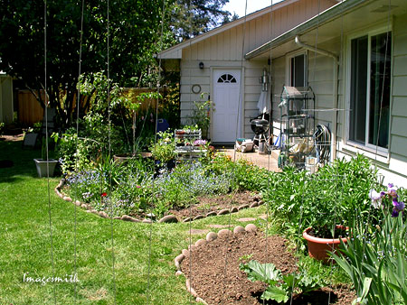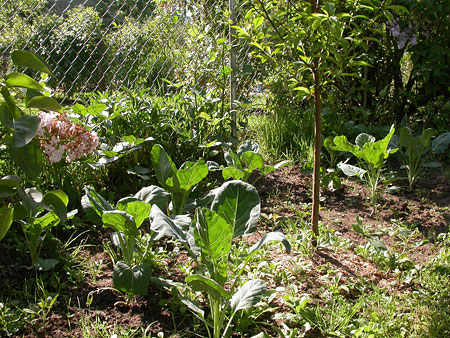 from an old pathway. The bed in the foreground contains a rhubarb