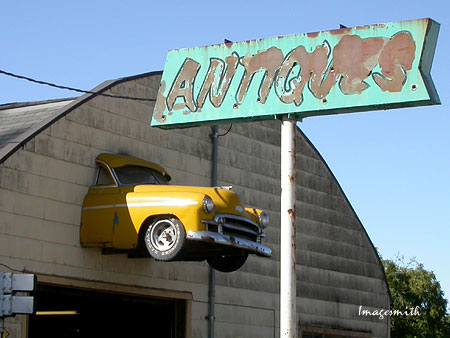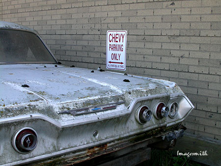 ![]() When I stopped to get a look at the elevators, I pulled off around a corner to park and noticed this sign across the street. Around the corner of the building I discovered a sculptor of sorts, who really did like Chevys, as you can see below: |