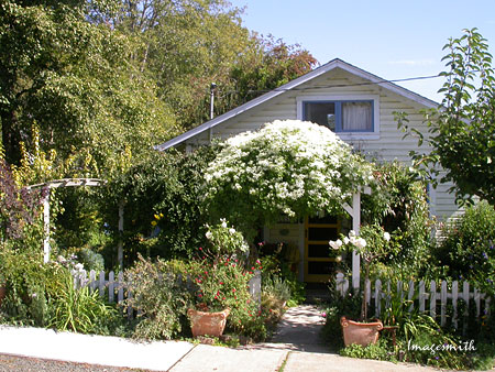 Another cozy-looking home in the old part of Brownsville beckons with an arbor overflowing with flowers.
