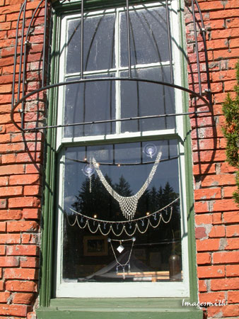 This tall window along the side of a Main Street shop displays jewelry, and shows off the old brickwork of which many nearby buildings are constructed.