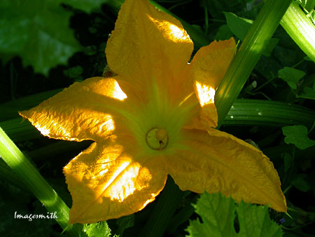 ![]() A squash blossom brightens the shadows between huge leaves.
