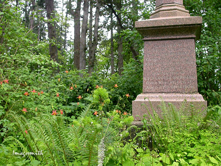 ![]() A basin-shaped memorial, unique among the cemetery monuments, and two broad, decorated headstones sit among the billowing greenery, watching over the yearly cycle of life here.
