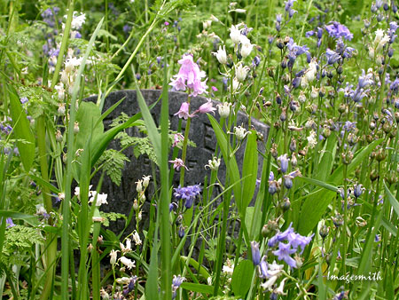 ![]() A headstone plays peek-a-boo, hidden behind grasses and the last blooms of pink and blue wood hyacinths.