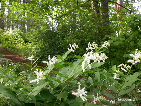 ![]() Beside an upward trail, false Solomon's seal brightens the view. The cemetery is home to many of the native species of flora found in nearby forests, such as fawn lilies, bleeding hearts, Oregon iris, inside-out flower and camas, in addition to more cultivated flowers like hellebores, daffodils, lilac and crocus.