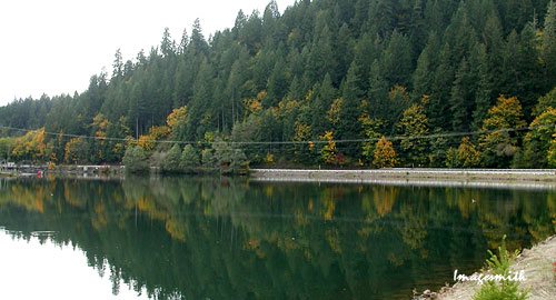 Always water: the edge of Leaburg Lake, created by a hydroelectric dam on the river which is run by EWEB, the Eugene utility company. The highway separates the mountainside from its mirrored reflection. |